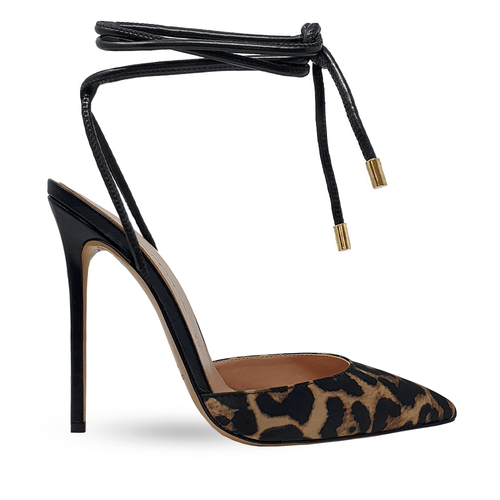 Pointed slingback pumps in spotted satin with ankle laces, 100mm or 120mm stiletto heel