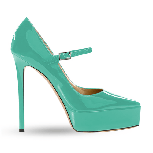 Pointed patent leather pumps with adjustable strap, 3.5cm platform and 13cm heel