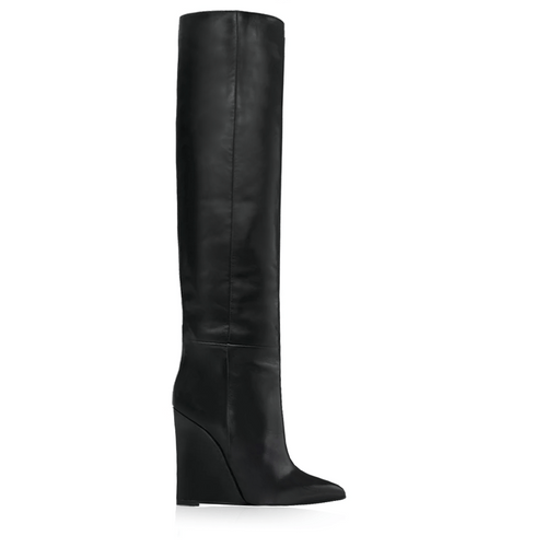 Tubular boot below the knee in genuine leather with 100mm wedge