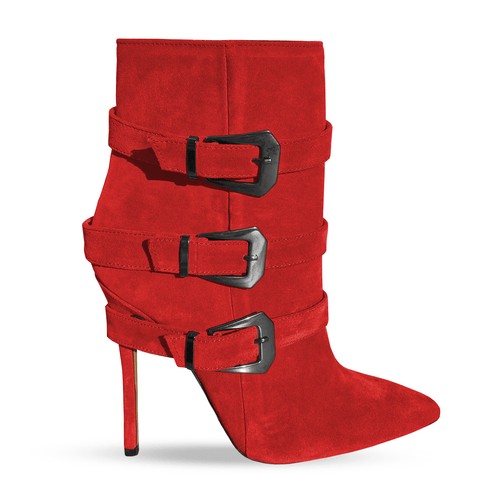 Pointed toe suede ankle boot with 3 side buckles and 100mm or 120mm stiletto heel