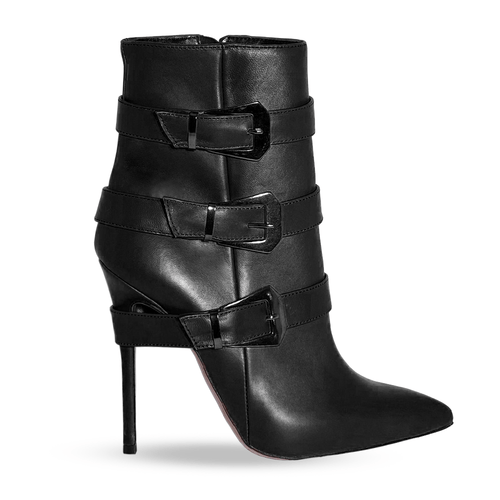 Stivaletto a punta sfilata in vera pelle con 3 fibbie laterali e tacco a spillo 100mm o 120mm